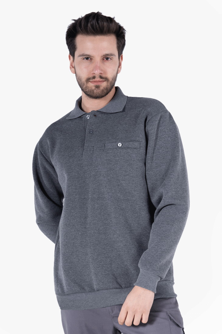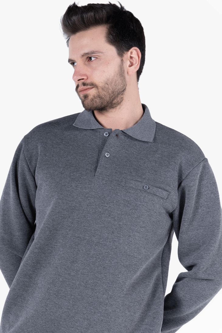 3 İplik Polo Yaka Fleto Cepli Sweatshirt - Füme Melanj