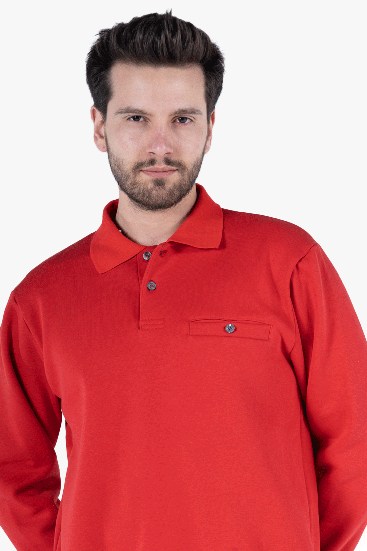 3 İplik Polo Yaka Fleto Cepli Sweatshirt - Kırmızı