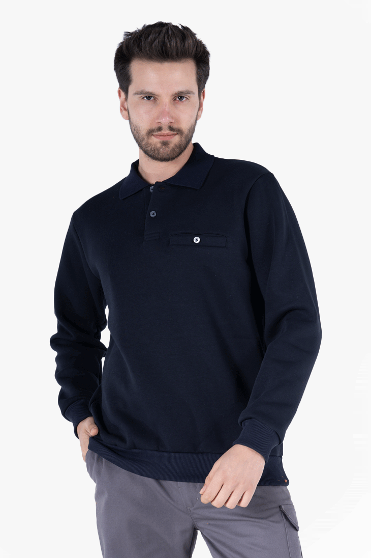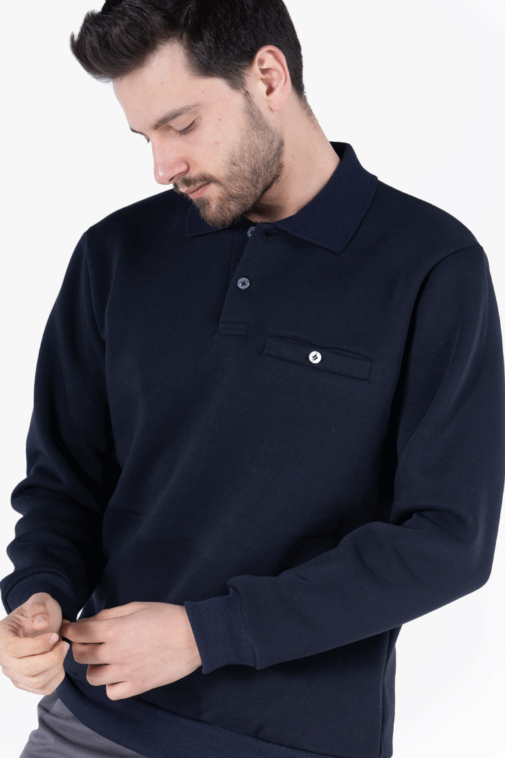 3 İplik Polo Yaka Fleto Cepli Sweatshirt - Lacivert