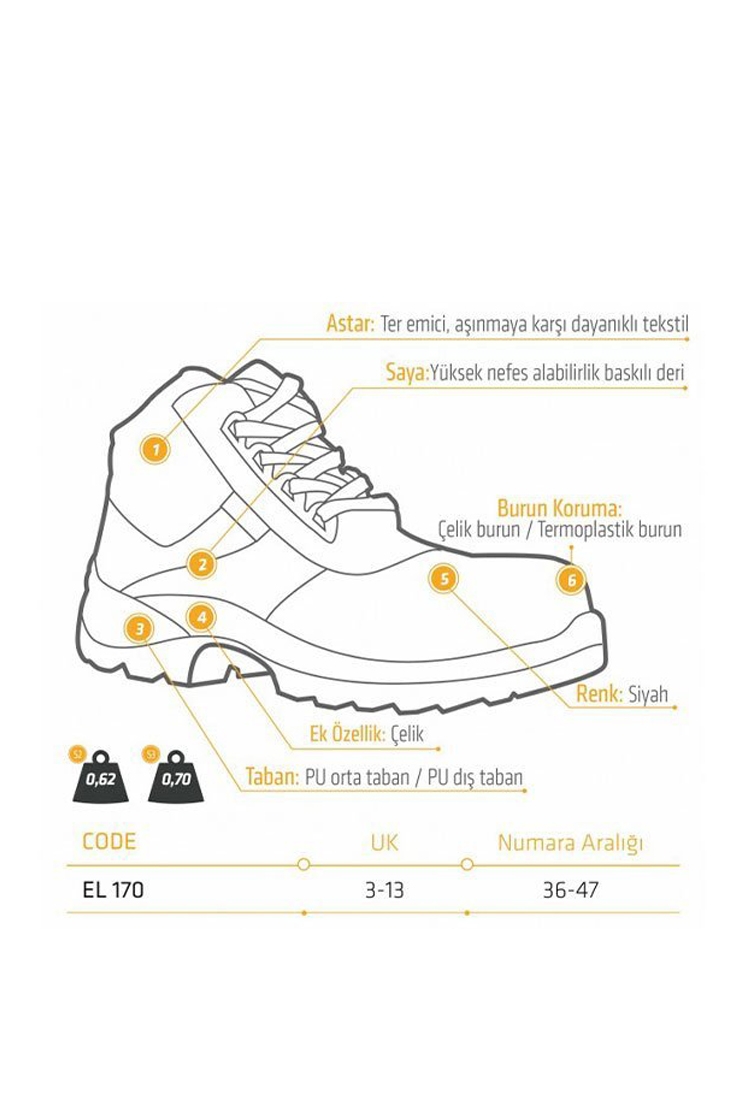 Zorlu çalışma koşulları için tasarlanmış yüksek performanslı bir iş güvenliği botu olan EL 170 S2, hakiki deri yapısı nefes alabilirlik sağlarken, çelik burun yapısıyla darbelere karşı üstün koruma sunar.