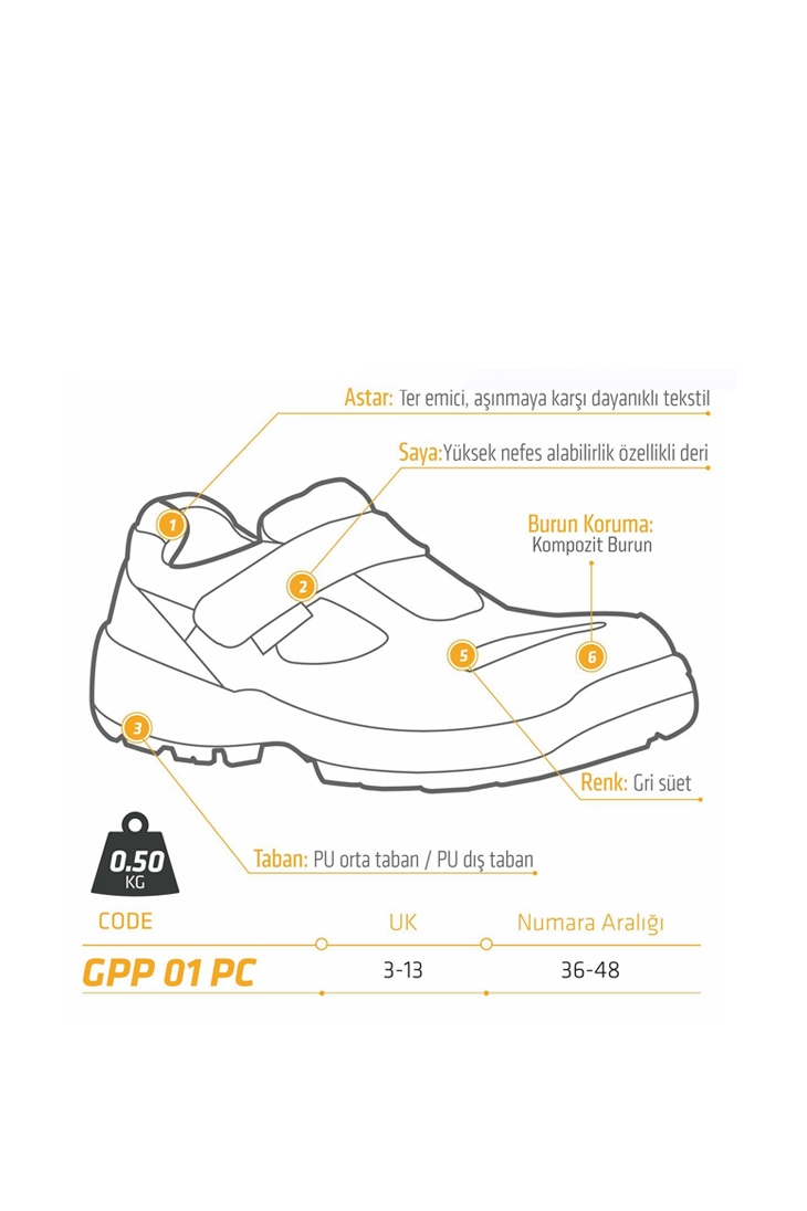 Zorlu çalışma ortamlarında ayaklarınızı korumak için ideal bir seçim olan GPP 01 PC, dayanıklılığı ve konforu ile en iyi iş güvenliği ayakkabılarından biridir.